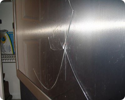 "So my girlfriend and I were taking our Wii Fitness tests one night and her second event was hitting homeruns. She was having trouble hitting one so I told her she needed to swing harder. Well she did, she just forgot to grip harder. The result: a broken window. The pisture is of my girlfriend Eliot and the damage done. -Paul"