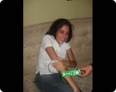 "Yesterday, I was at wii game's night along my cousins and my boyfiend. We decided to Play tennis (Wii Sports) I was playing doubles with my boyfriend against 2 cousins. Anyway, we were almost winning the game and we were all very concentrated when my boyfriend aly hit me with his remonte in my elbow. I felt a pain in my arm and had to throw myself to the couch before fainting. these pictures show what happened."